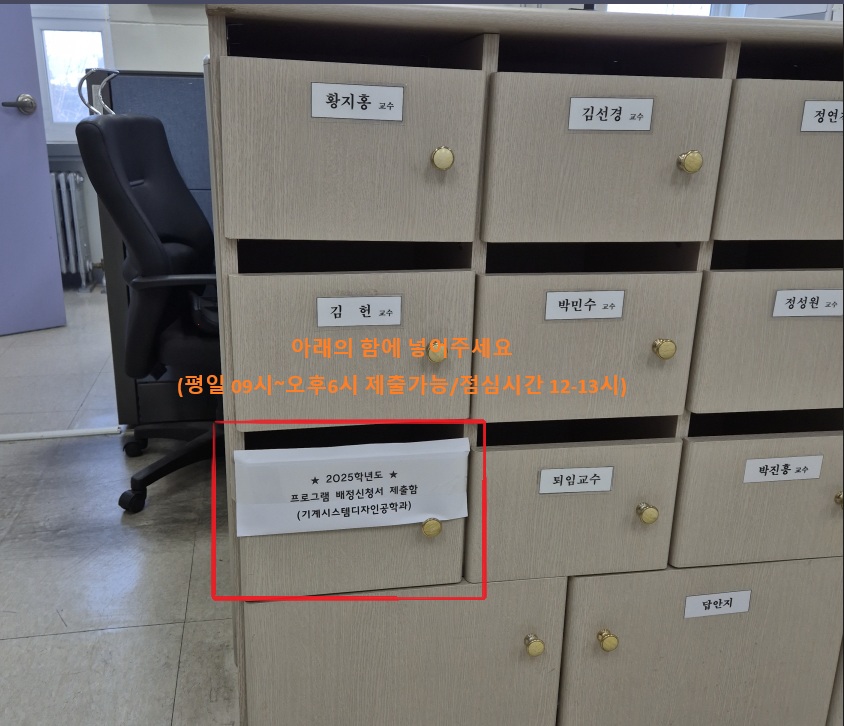 안녕하세요? 기계시스템디자인공학과 학과사무실입니다. 2025학년도 프로그램 배정 신청서 제출 기간을 아래와 같이 공지하오니, 해당 학생들은 기한 내 제출하여 주시기 바랍니다.