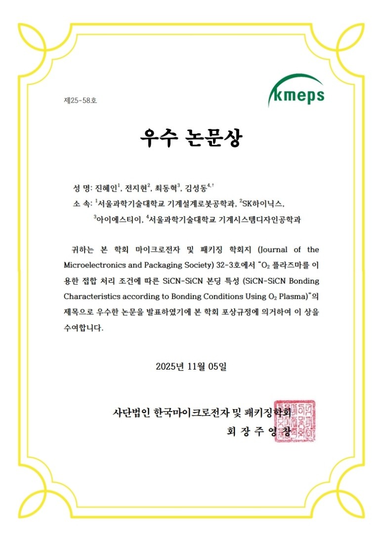 일반대학원 기계설계로봇공학과 전자소자연구실(지도교수: 김성동) 소속 진혜인 석사과정 학생이 마이크로전자 및 패키징 학회지(Journal of the Microelectronics and Packaging Society) 제32권 3호에 게재한 논문으로 우수논문상을 수상했다. 한국마이크로전자 및 패키징 학회는 매 호마다 학술적 기여도가 높은 논문 한 편을 선정해 우수논문상을 수여하고 있으며, 진혜인 학생의 논문「O₂ 플라즈마를 이용한 접합 처리 조건에 따른 SiCN–SiCN 본딩 특성」이 이번 수상작으로 선정되었다.