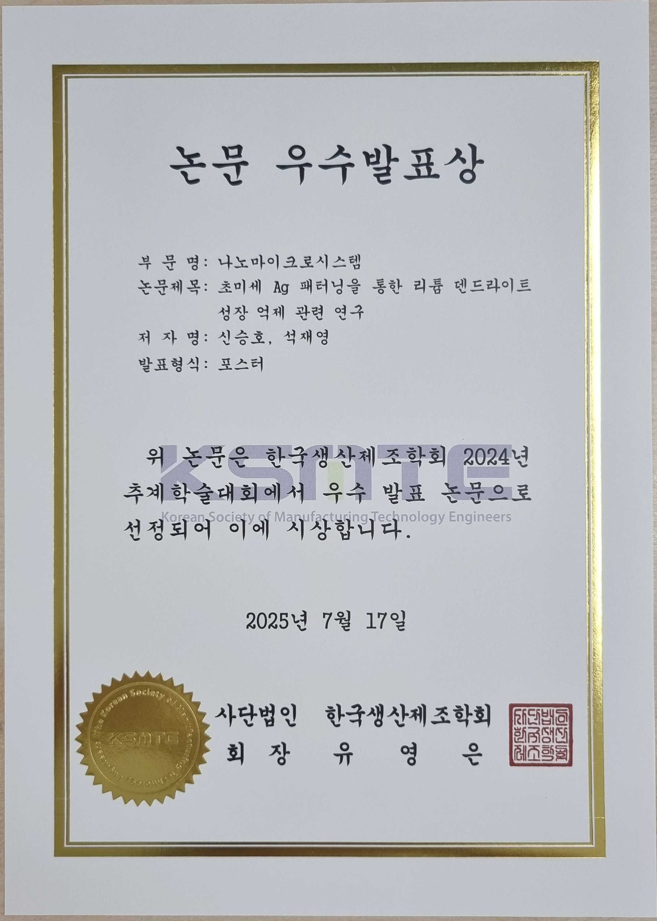 [기계설계로봇] 신승호 석사과정, 한국생산제조학회(나노마이크로시스템 부문) 논문 우수발표상 (지도교수:석재영)