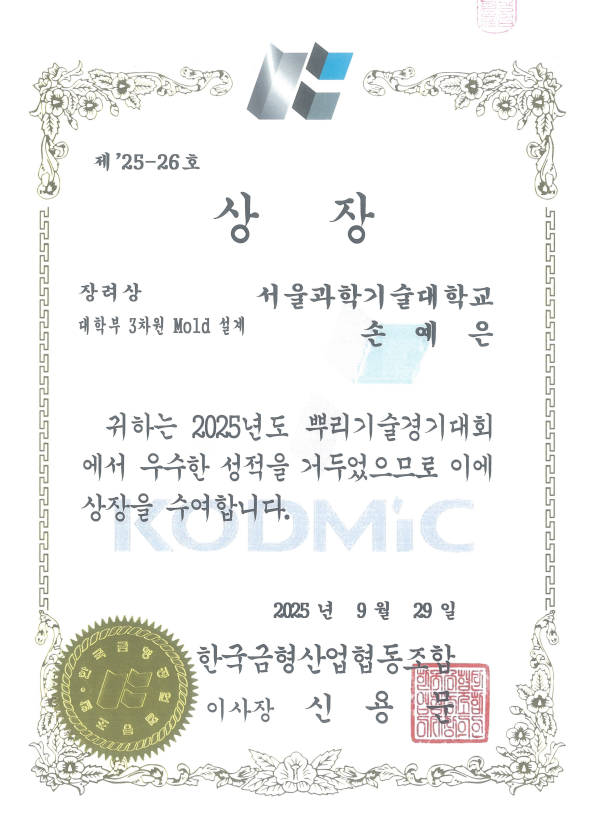 -손예은 (기계시스템디자인공학과 3학년) 장려상(3차원 Mold 설계 분야), 한국금형산업협동조합상 수상 |