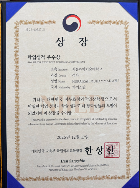 | 제목 | [기정]기계정보공학과 석사과정 아부(Hurairah Muhammad Abu), 2025년 GKS 장학생 학업성적 우수상 수상 | 날짜 | 2025-12-18 | 조회수 | 51 |